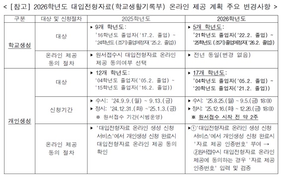 2026학년도 대입에서는 2004학년도 고교 졸업자(‘05.2월 졸업)부터 2020학년도 고교 졸업자(’21.2월 졸업)까지 희망하는 경우, ‘대입전형자료(학교생활기록부) 온라인 생성 신청 시스템(apply.neis.go.kr)’을 통해 학교생활기록부 온라인 제공이 가능합니다.